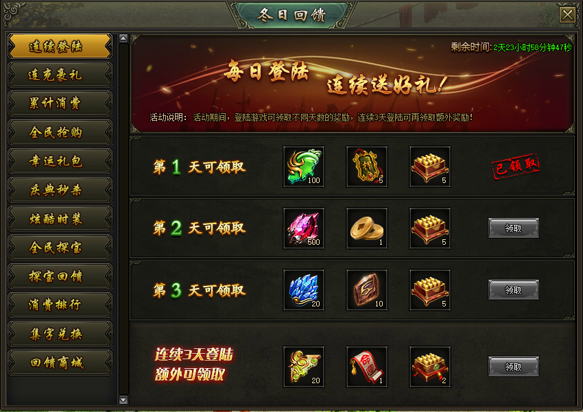 活动说明:活动期间,登陆游戏可领取不同天数的奖励,连续3天登陆可再领取额外奖励