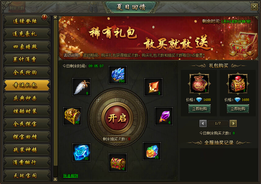 活动说明:活动期间,购买礼包获得抽奖次数,购买礼包次数和抽奖次数每日0点重置