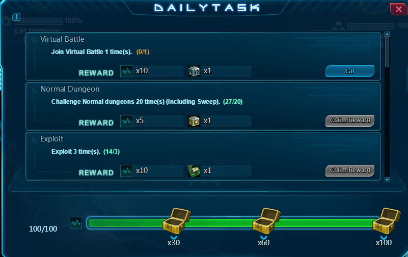 从23级开始正式告别了新手引导期,往后升级没那么容易了,此时要积极做每日任务,每日任务的3个宝箱领取时可获得总计6000点经验值,足够你再提升1个等级,而且这也意味着你每天都可以拿走这6000点经验值,每日任务还很容易完成,跑完新手引导基本上大半的任务都可以领取,比较麻烦的就是支付20IC的任务,这个任务推荐每天在HQ SUPPORT里购买VITALITY,点击2次可额外获得1200点,刚好消费20IC,靠着每日在线奖励赠送的IC可轻松完成,又能多拿VITALITY,用以往后升级使用,可谓一举两得。