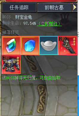每天前朝古墓会出现在天都城内,财宝金龟会掉落大量珍贵材料奖励,以及红装奖励。