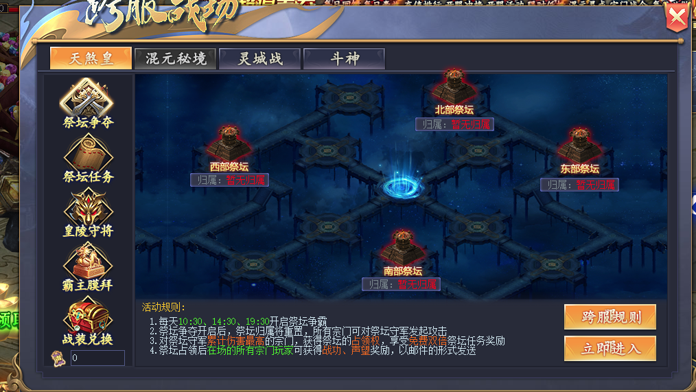 跨服战场每天10:30 ; 14:30 ; 19:30 开启祭坛