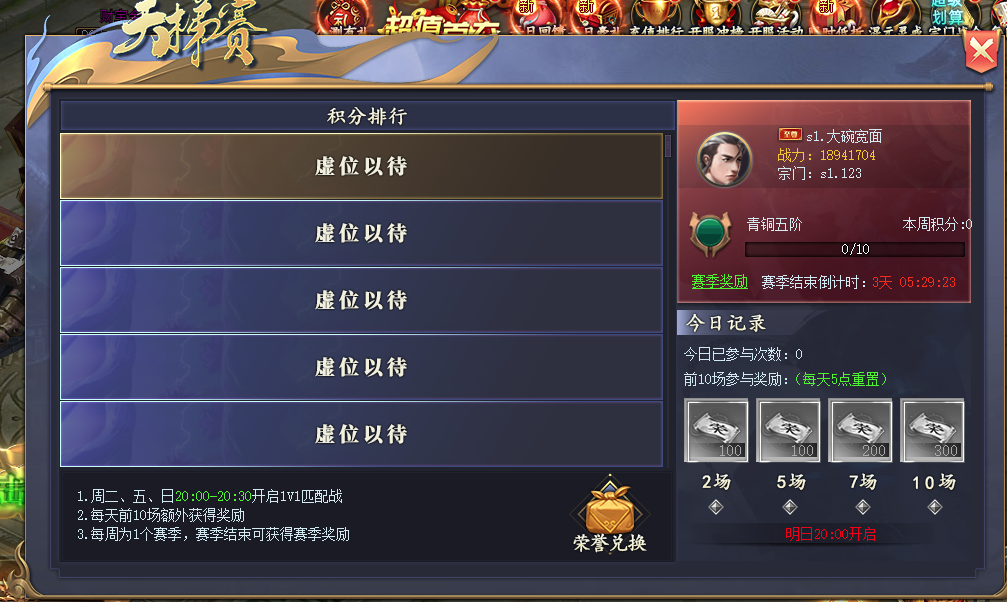 天梯赛活动入口位于主界面正上方每周二、周五,周日晚20:00-20:30