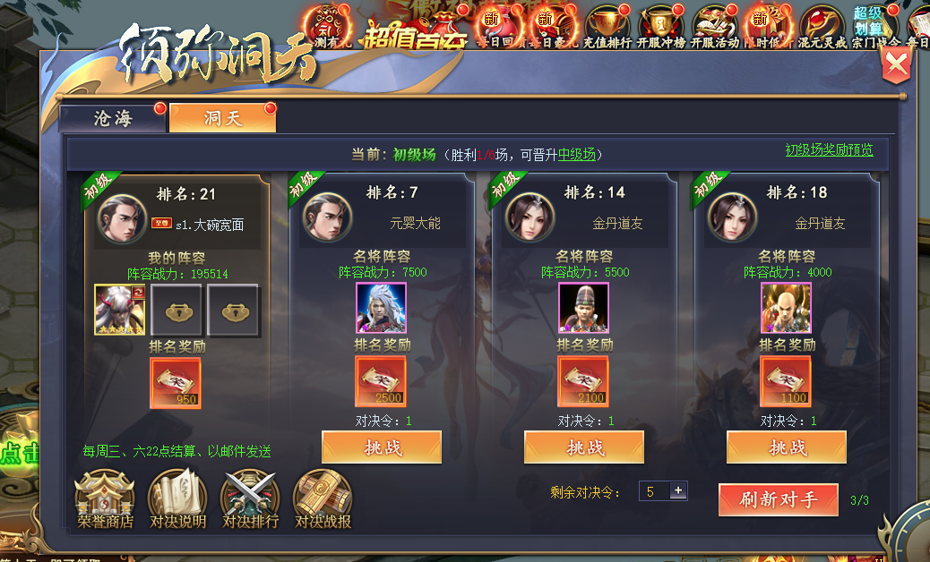 须弥洞天分为初级中级高级场,每胜利6场即可进阶