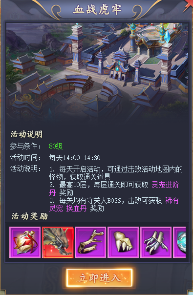 最高可通关10层,击败每层守关boss即可获得灵宠进阶丹,稀有灵宠,换血丹奖励。