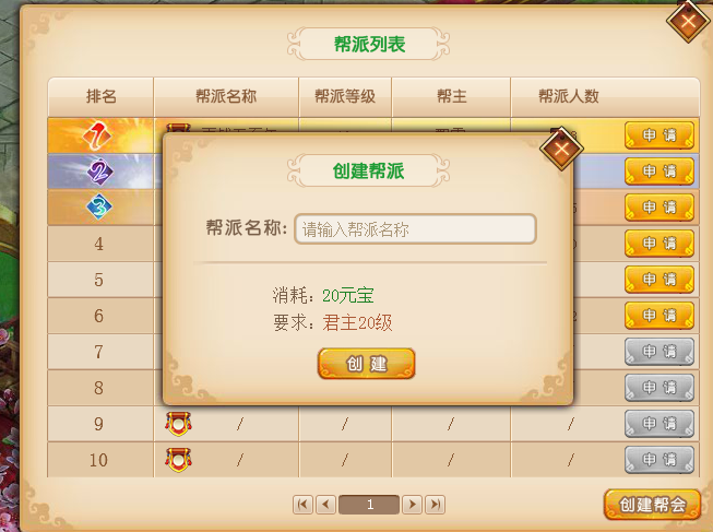 1. 玩家在等级达到25级时候开启帮会系统,玩家可以创建帮会,消耗20元宝。或者申请加入别人帮会