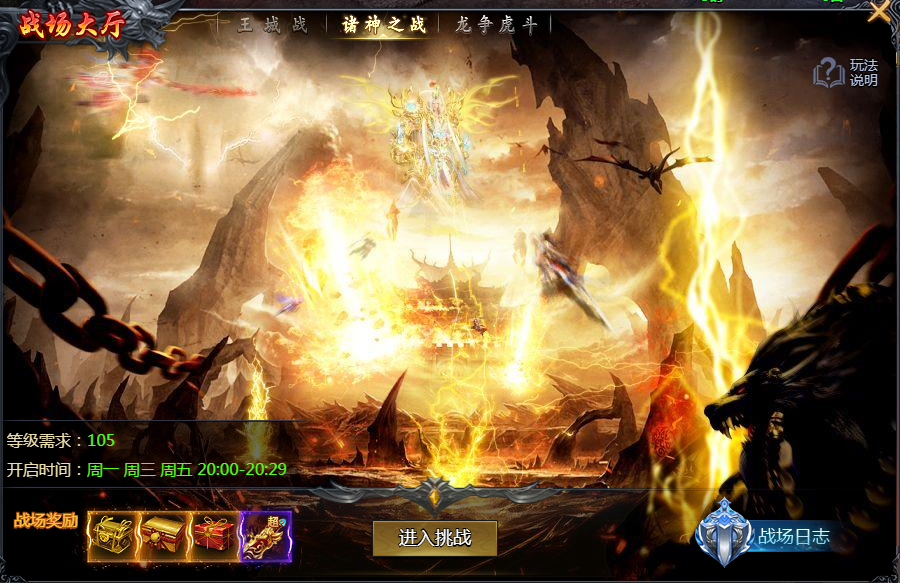 7. 活动最后5分钟,进行最终争夺战,最终夺得战旗的玩家将获得神王秘宝超级大礼包以及称号-诸神战王,有效期持续到第二天20:00