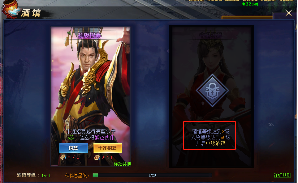 1. 欢迎来到伙伴酒馆,在这里你可以进行伙伴招募,收获全新的强力伙伴。2. 单次招募消耗“招募令”可获得伙伴碎片或完整伙伴。