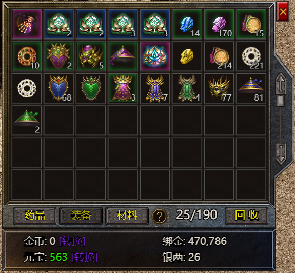(1) 背包分为药品包裹、装备包裹、材料包裹三类。药品包裹上限48格,存放药品和消耗品;装备包裹上限190格,存放装备类物品,双击装备可以穿戴;材料包裹上限190格,存放材料类物品(2) 捡取物品、收取邮件、领取奖励时必须在各个包裹保留足够的空格,领取药品时通常不会判断药品包裹剩余空位,可能造成领取的药品消失