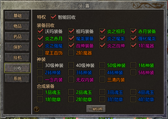 (1) 沃玛级以下装备会直接回收。沃玛级及以上装备需要勾选后才会一键回收,穿戴在角色身上的装备不会被回收。(2) 药品和材料需要蓝卡会员特权才能一键回收,特权不符的可在【背包-回收-单件回收】中回收