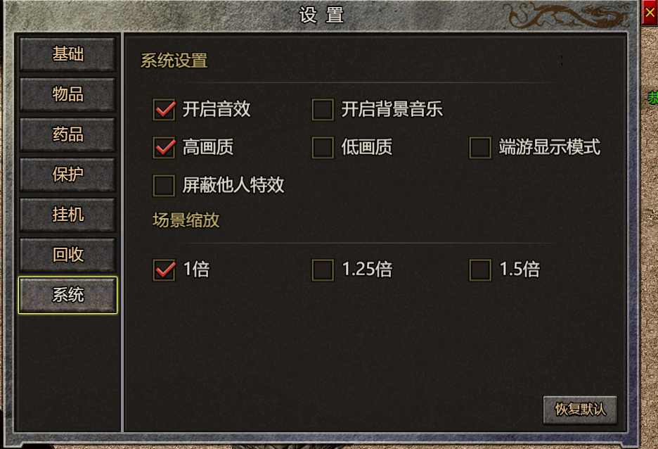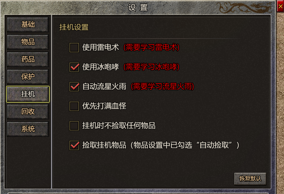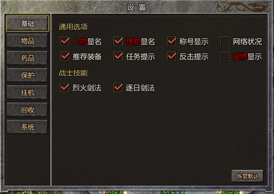 (1) 游戏设置功能包括【基础】、【物品】、【药品】、【保护】、【挂机】、【回收】、【系统】设置基础设置