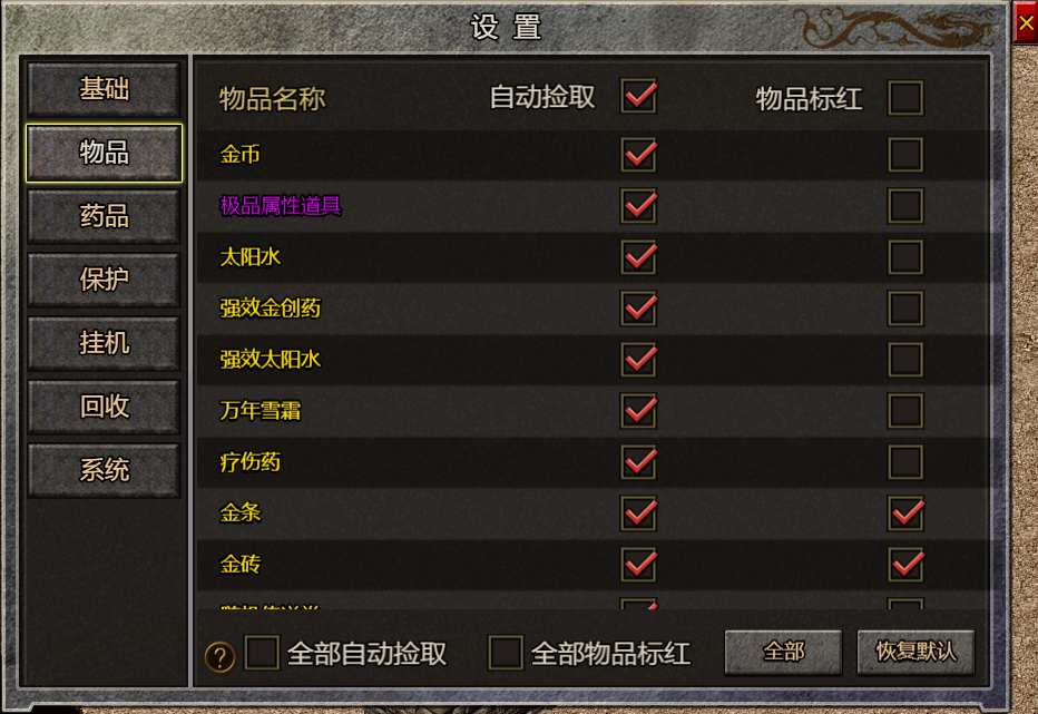(3) 界面下方的全部自动捡取和全部物品标红可以直接对所有物品进行设置调整,避免对每一个物品打勾的麻烦