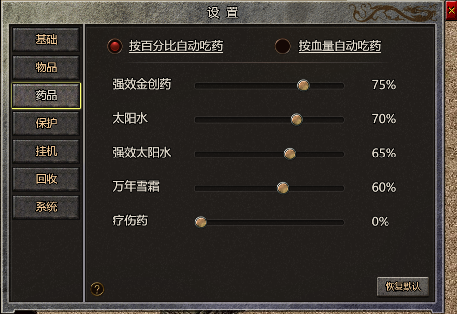 (1) 普按百分比自动吃药和按血量自动吃药同时只有一个生效(2) 按百分比自动吃药强效金疮药间隔为1秒,太阳水、强效太阳水、万年雪霜、疗伤药间隔为0.6秒