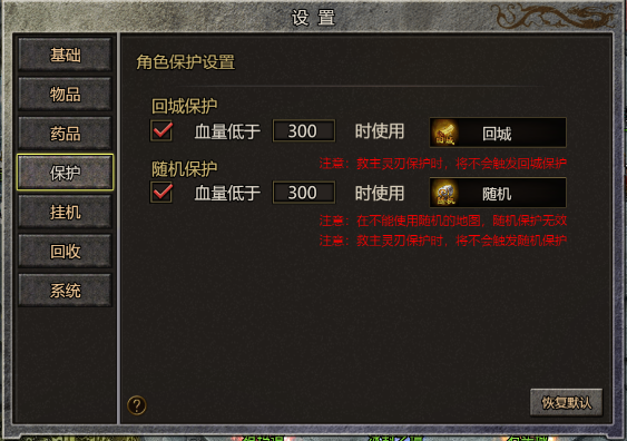 (1) 回城技能有CD,部分地图无法使用随机传送功能,设置和使用保护功能时请注意(2) 保护功能在安全区不会触发,受PK惩罚的玩家(红名角色)需要注意