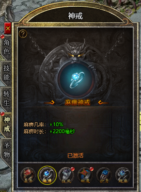 (2) 激活后在麻痹戒指基础上,麻痹几率再+2%,抗麻几率+12%,麻痹时间在原有基础上增加0.2秒