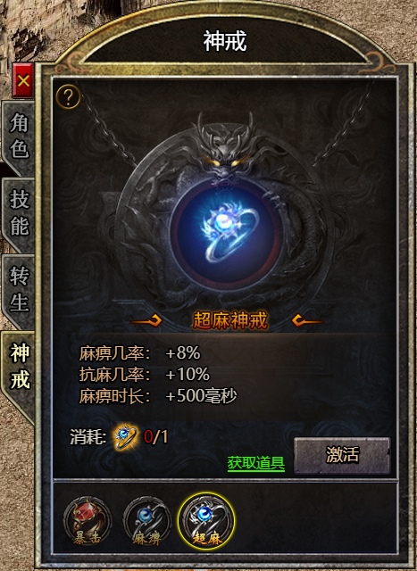 (3) 激活超麻神戒后获得12%抗麻几率,直接免疫所有麻痹戒指效果