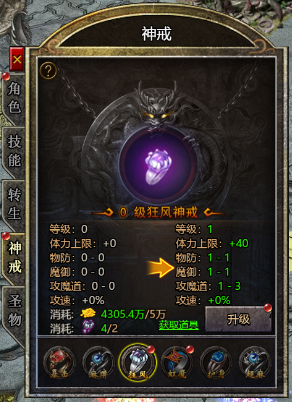 (1) 使用狂风碎片可以提升狂风神戒级别,增加攻魔道、双防、攻速属性