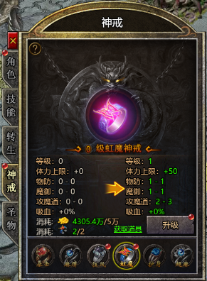 (1) 使用虹魔碎片可以提升虹魔神戒级别,增加攻魔道、双防、吸血属性
