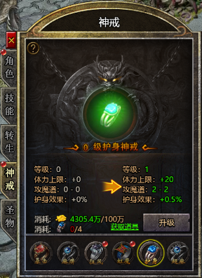 (1) 使用护身碎片可以提升护身神戒级别,增加攻魔道、血量上限、护身效果属性