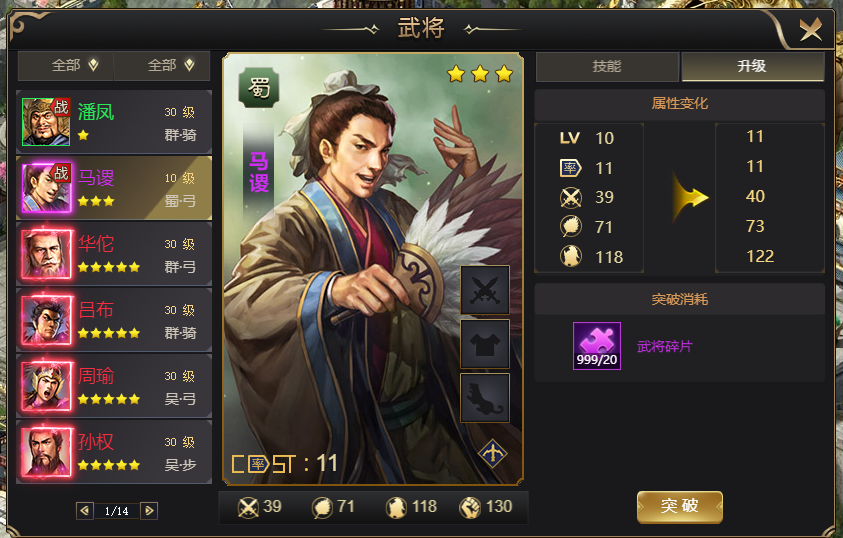 3.每十级武将需要突破一次,突破消耗武将碎片,不同颜色的英雄突破需要的碎片品质和数量不同;