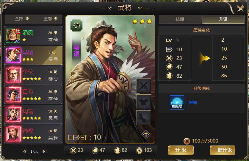 1.通过主界面武将按钮,可以进入武将界面,可查看自己已拥有的武将;2.通过消耗将魂和金币可升级武将,武将每升10级可激活一个武将技能,最高等级上限为30级;