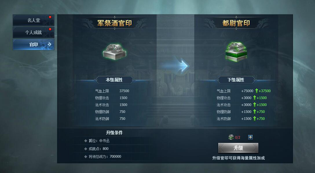 玩家们在游戏中可以升级自己的官印,为所有武将提供大量属性加成,官印级别越高,加成属性越多。升级官印需要达成指定的爵位、战力、成就点数等条件,升级时消耗指定的官印道具即可成功升级。