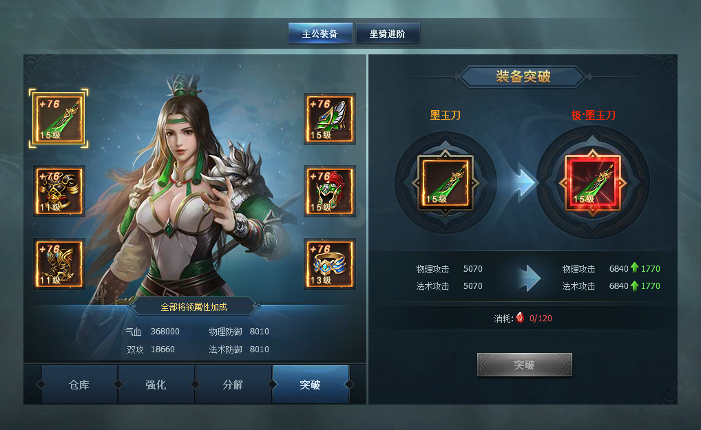 5. 装备突破:在游戏内,还可以将橙色品质的装备突破至超强的红色品质,大幅度提升装备属性。橙装突破需要消耗道具血晶石。