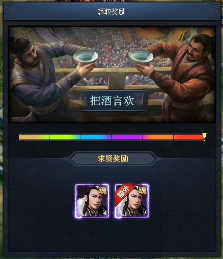 4. 求贤奖励:求贤结束后,可获得大量求贤将领对应的将魂碎片。选择与求贤将领有宿命关系的将领出访能获得更多的碎片奖励。