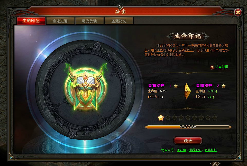 种类:生命印记、帝龙之泪、曙光战魂、圣耀符文;属性加成:每种法宝均有不同属性加成,可使用对应的材料进行提升,获得更强大属性;