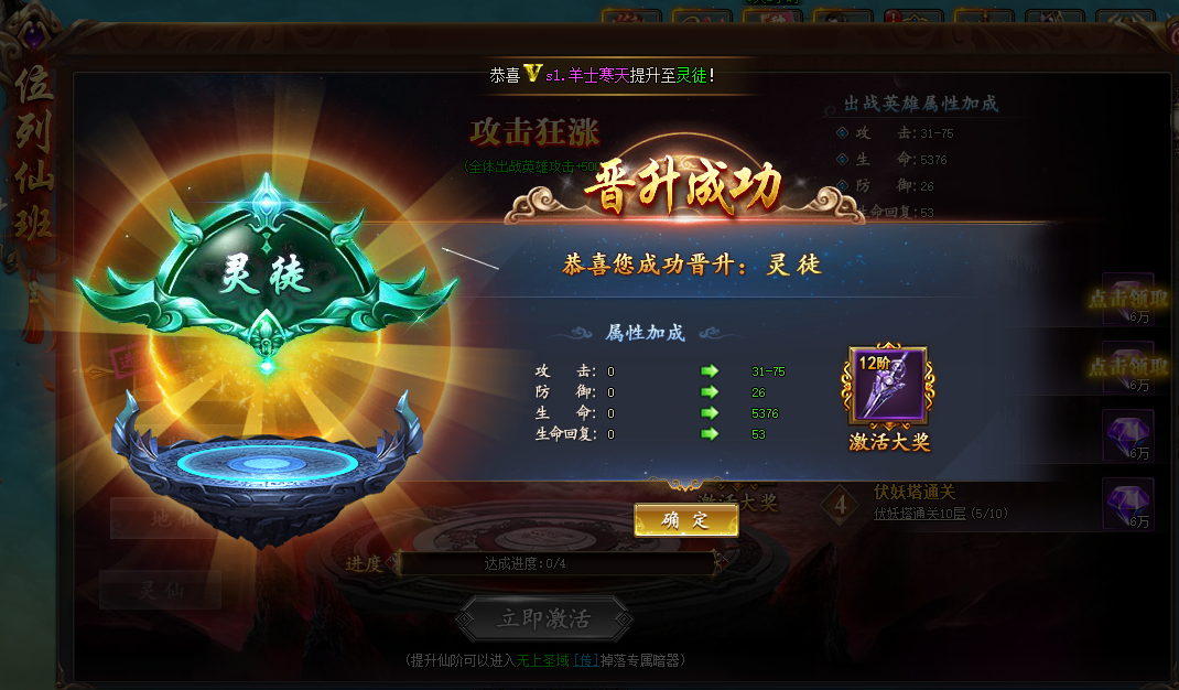 在战队成型后,将开启成长道路上一个重要的系统 --- 【位列仙班】,位列仙班共有52个仙职,激活每个仙职所需要达成的所有条件后,不仅可以获得仙职的对应称谓以及属性加成,还能开启特殊的效果以及激活大奖。