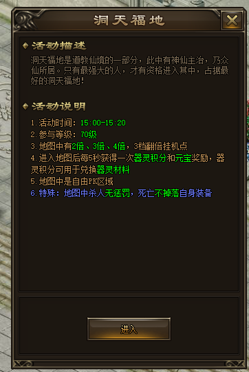 开启后玩家可通过主城活动NPC处进入活动地图,可以获得大量的器灵积分