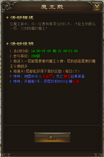 魔王殿每天14点和22点开启两次,魔王殿共有10层,每通关1层都能获得不菲的奖励