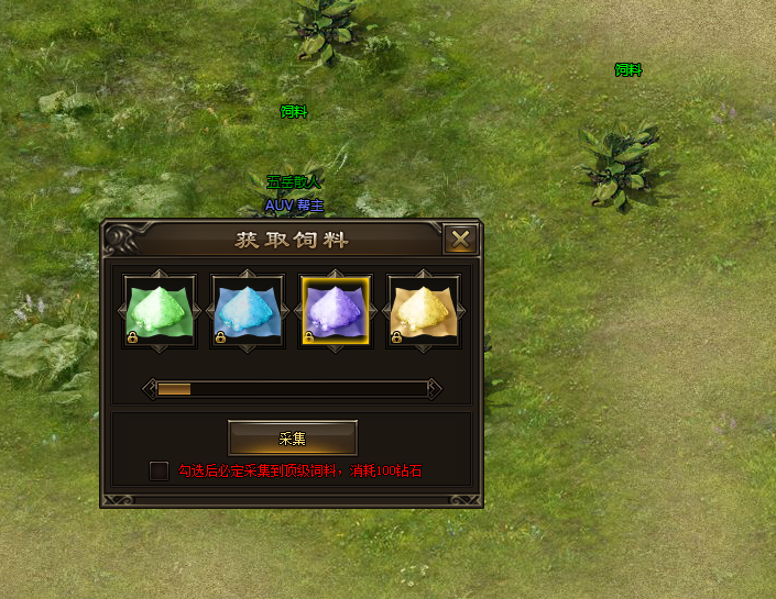玩家可在帮会驻地采集饲料来喂养帮会神兽;每次只可采集一个饲料,确定收取饲料后才会获得饲料,饲料的等级越高喂养神兽获得的祝福值越高,祝福值满后,可由帮主、副帮主、长老开启神兽祈福!