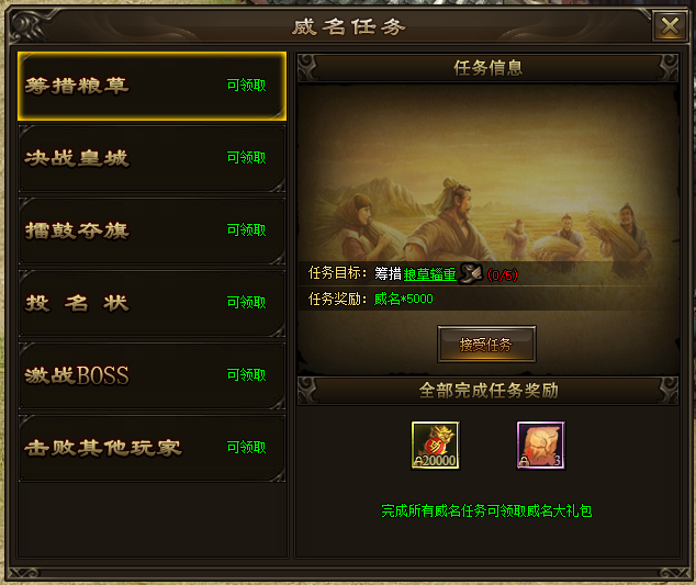 威名任务在主城66,136附近接取,任务共有6种,每种任务每天可完成一次,完成任务可获得威名值和藏宝图