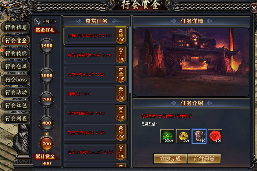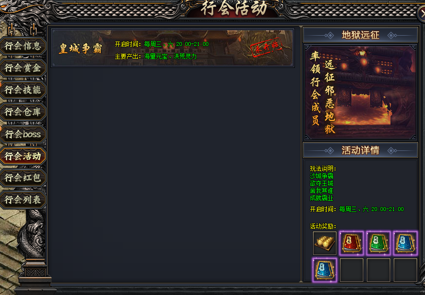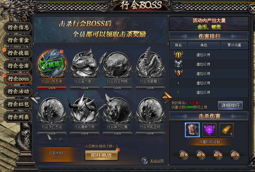 击杀行会BOSS可获得奖励,对BOSS的累计伤害值进行排名,根据排名获得排行奖励;