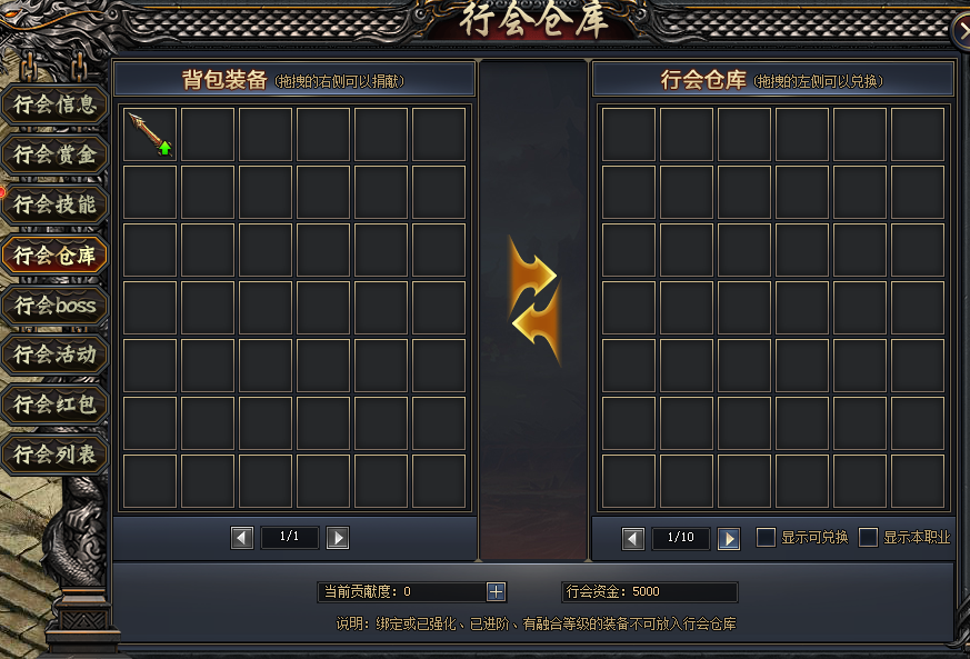 把多余装备捐献到行会仓库,可获得贡献度,同时可消耗贡献度兑换行会仓库内的道具;