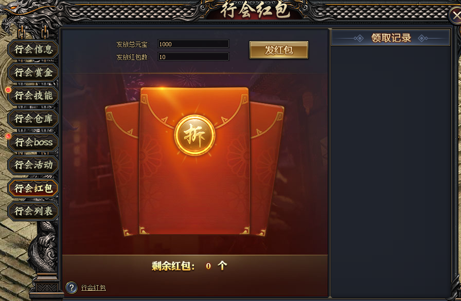 所有成员可发放红包、抢红包,所抢红包金额随机发放,红包过期后,剩余元宝将以邮件形式返还发红包的玩家;