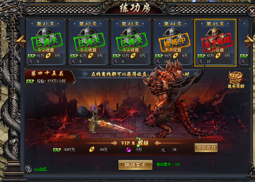 挑战关卡并通关可获得大量经验奖励,不管在线离线,都能稳定获得收益,通关层数越高,获得收益越多;