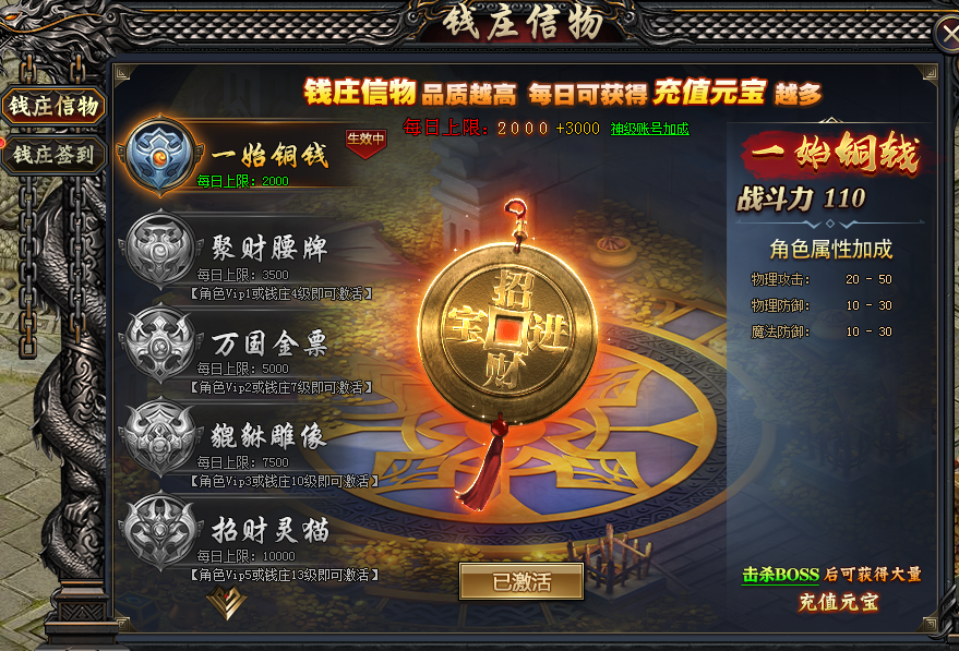 激活钱庄每日可领取大量元宝,击杀BOSS后可获得丰厚奖励