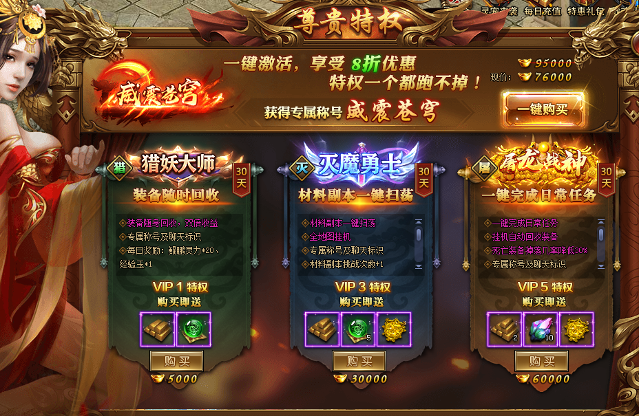 灭魔勇士:每日首亡不掉装备,击杀怪物经验+20%,专属称号及聊天标识‘灭’,每日50鲲鹏灵力和经验玉*2,材料副本扫荡次数+2(价格:30000元宝,有效期:30天)