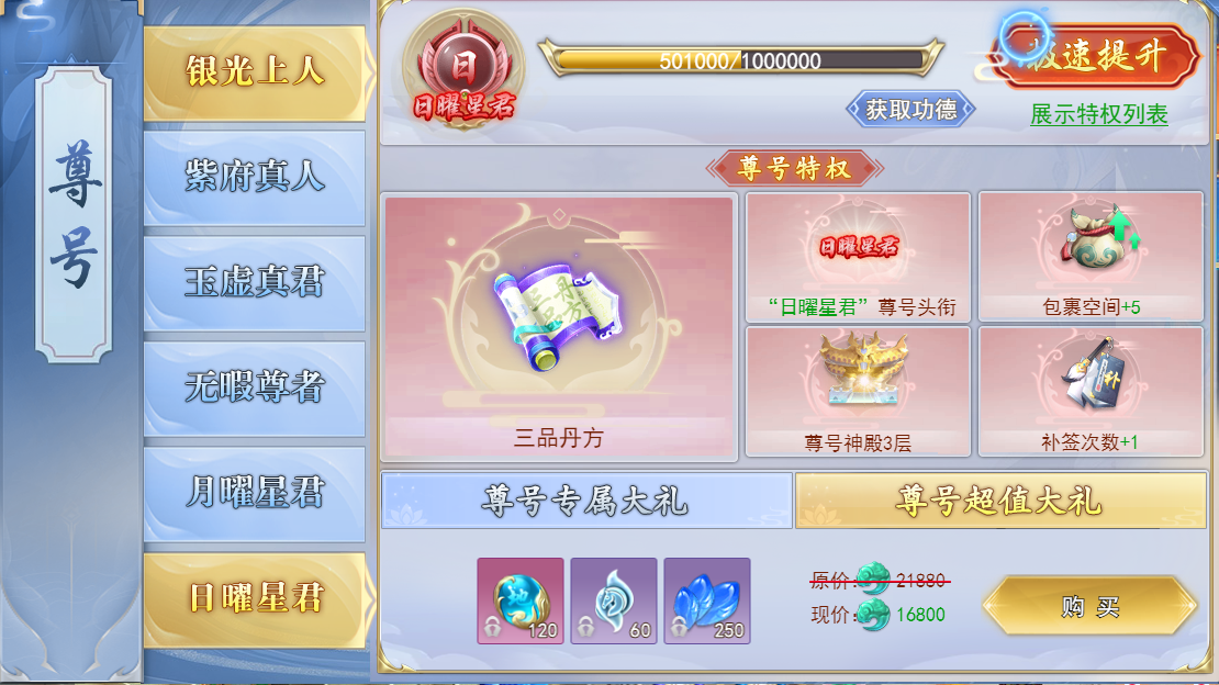 完成一个阶段的任务可以获得更高阶的尊号,越高级的尊号,专属大礼的奖励也会越高,还有超炫酷的称号、包裹空间增加、聚灵时间加成、服用丹号上限等诸多功能。