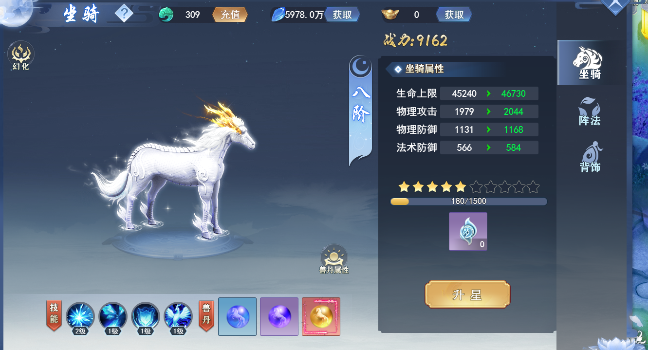 坐骑、阵法、背饰等级越高,会外形上发生变化,更好看的同时也会为人物提高属性~
