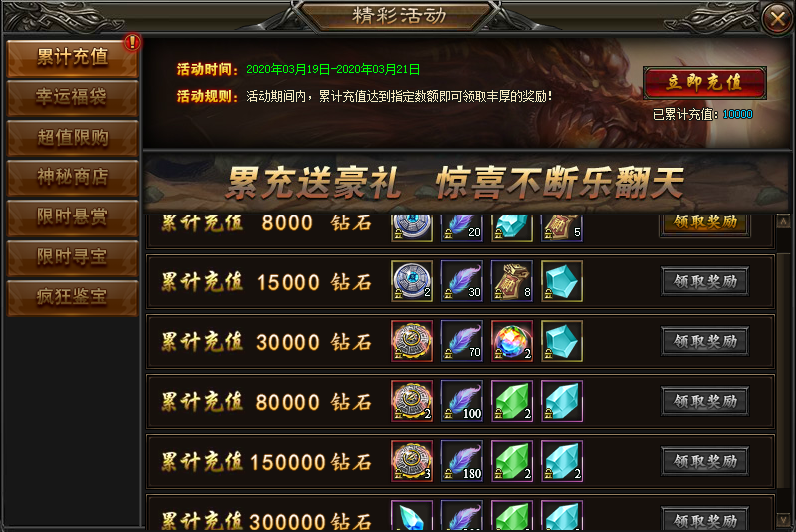 规则:累计充值达到相应的额度,即可领取奖励。