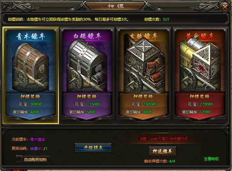 日常押镖可以获得大量元宝和宝物升级用的精华材料,是每天必做的日常活动之一。玩家可以消耗换镖令提升镖车品质,获得更多奖励,另外每天有双倍押镖时段,期间完成押镖可以获得双倍奖励。