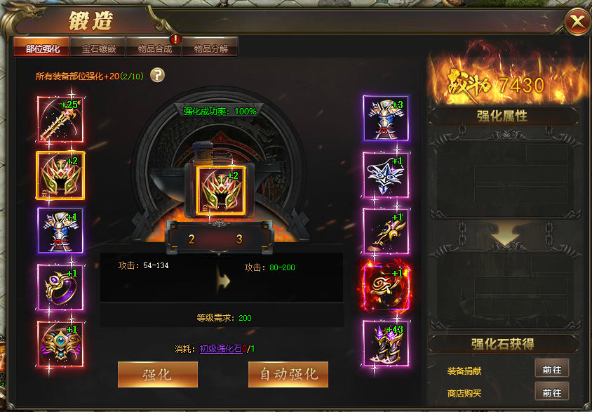 部位强化可以通过消耗强化石强化装备部位的属性,所有部位达到一定的强化等级还可获得套装效果加成