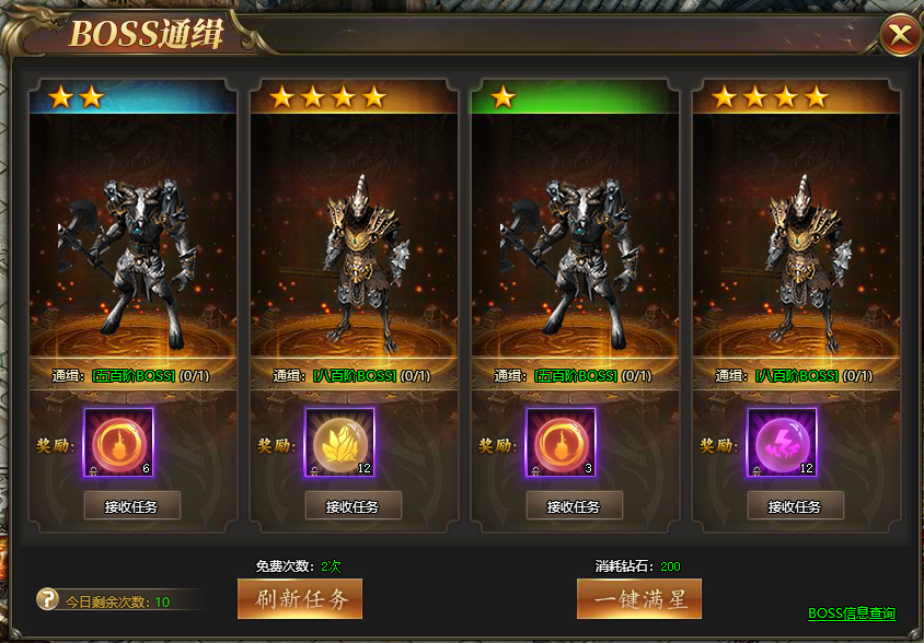 每天可以接取10次BOSS通缉,BOSS通缉完成后可获得大量元神觉醒所需的各属性元灵,每天完成BOSS通缉,元神将更快觉醒