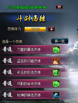 斗剑历练是玩家磨练自我,挑战极限的场所,在这里可以获得增益Buff和各种道具及礼券。斗剑历练的默认冷却时间为1分钟,可以花费仙石立刻冷却。斗剑需要历练体力,历练体力每小时增加1点。斗剑历练分为两步,第一步选择历练种类,第二步击败历练对手。击败了某个历练种类的5个历练对手即可获得历练奖励。历练种类和历练对手支持刷新,每次刷新需要消耗100银币。