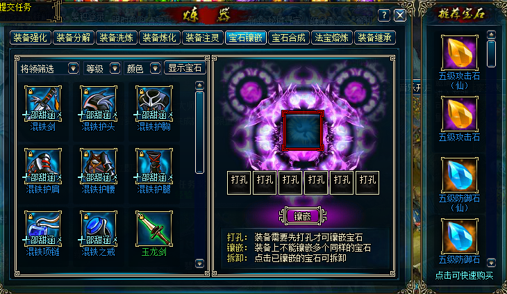 玩家可以根据自己的属性购买自己所需要的宝石,镶嵌宝石时需要使用相应的打孔石开孔。高级宝石可以由低级宝石合成,也可以在商城中购买,宝石合成可能会失败,所以一定要去买宝石保护符哦。