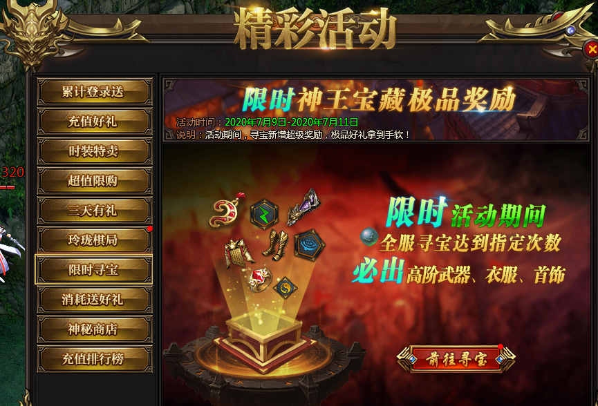 活动说明:神王宝藏限时发放极品装备、神器等,全服寻宝达到一定次数可获得保底奖励