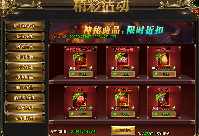 活动说明:神秘商店限时来袭,超低折扣,限时购买。同时可以通过刷新按钮,花费200神玉进行刷新