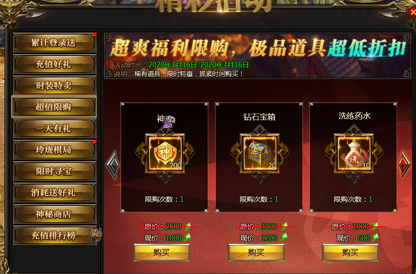 活动说明:一次购买,未来三天每日皆可领取极品奖励,助力成神
